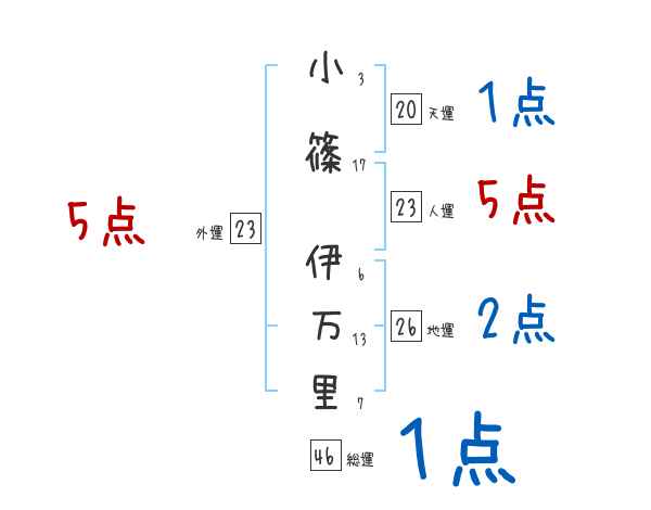 外運![]() | 小篠伊万里さんの外運は23画の5つ星!想像力に優れ活力がある。一代で成功し名誉を手に入れる。 生活面を象徴する運勢です。外部から受ける影響力を表し、結婚運、家庭運や職場、環境への順応性を表します。 |