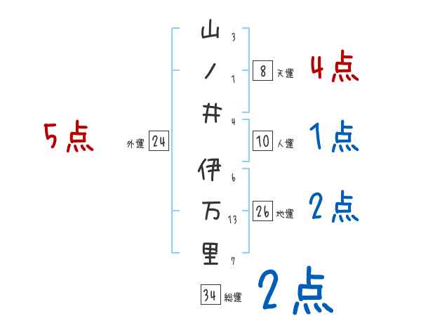 外運![]() | 山ノ井伊万里さんの外運は24画の5つ星!家庭運が良く順調な人生。金運にも恵まれる。 生活面を象徴する運勢です。外部から受ける影響力を表し、結婚運、家庭運や職場、環境への順応性を表します。 |