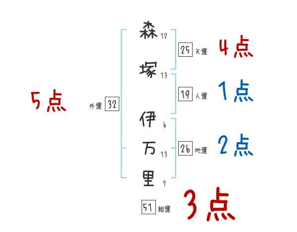 外運![]() | 森塚伊万里さんの外運は32画の5つ星!柔軟性があり成功する。チャンスが多く金運が良い。 生活面を象徴する運勢です。外部から受ける影響力を表し、結婚運、家庭運や職場、環境への順応性を表します。 |