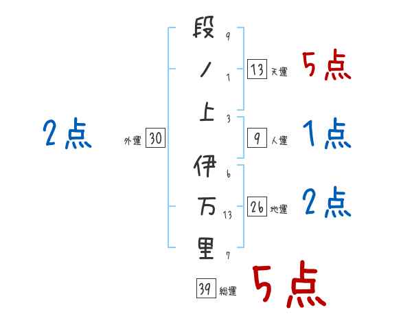 天運![]() | 段ノ上伊万里さんの天運は13画の5つ星!才能に恵まれ人気がある。名声を手に入れる。円満な人生。 家系が持つ宿命的な運勢を表します。祖先から受け継いだ苗字ですので自分の力が及びません。家柄を象徴します。 |