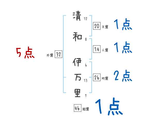 外運![]() | 清和伊万里さんの外運は32画の5つ星!柔軟性があり成功する。チャンスが多く金運が良い。 生活面を象徴する運勢です。外部から受ける影響力を表し、結婚運、家庭運や職場、環境への順応性を表します。 |