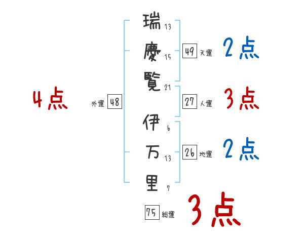 天運![]() | 瑞慶覧伊万里さんの天運は49画の2つ星!不安定な性格で明暗がある人生。周りの人には支援されやすい。 家系が持つ宿命的な運勢を表します。祖先から受け継いだ苗字ですので自分の力が及びません。家柄を象徴します。 |