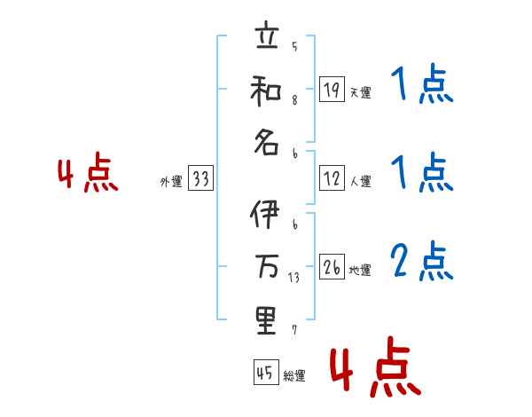 天運![]() | 立和名伊万里さんの天運は19画の1つ星!優れた才能を持ちますが、協調性が足りないことも。周りの人と協力する事を意識しましょう。 家系が持つ宿命的な運勢を表します。祖先から受け継いだ苗字ですので自分の力が及びません。家柄を象徴します。 |