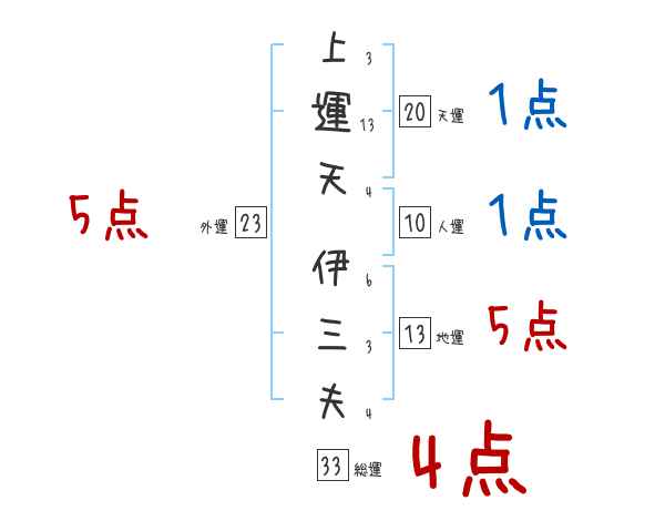 人運![]() | 上運天伊三夫さんの人運は10画の1つ星!不安を感じやすい傾向。ストレスを抱えないように注意しましょう。 性格や才能などを表す2番目に重要な運勢です。人間関係や協調性、社会的な成功に影響します。主に20歳から50歳ぐらいまでの中年期の運勢を表します。 |