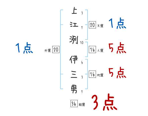 総運![]() | 上江洌伊三男さんの総運は36画の3つ星!先見性が豊かです。多少神経質で苦労することも。 あなたの人生を表す1番重要な運勢です。生涯を通じて影響する総合運となり、主に50歳以降の晩年期に影響を及ぼします。 |