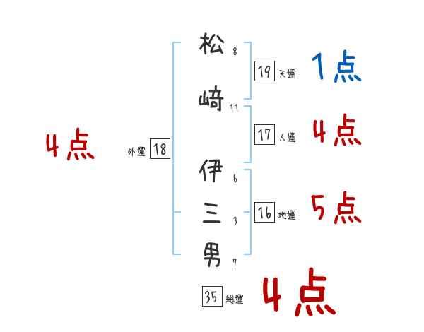 外運![]() | 松﨑伊三男さんの外運は18画の4つ星!情熱的で剛気。忍耐力があり信頼される。 生活面を象徴する運勢です。外部から受ける影響力を表し、結婚運、家庭運や職場、環境への順応性を表します。 |