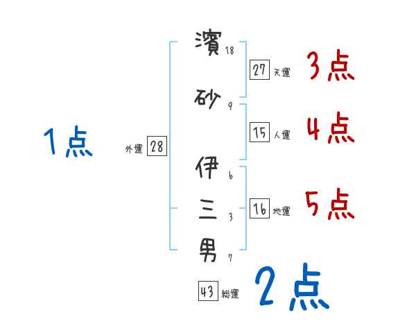 天運![]() | 濱砂伊三男さんの天運は27画の3つ星!頭脳明晰だが強情で摩擦が多い傾向。孤立に注意。 家系が持つ宿命的な運勢を表します。祖先から受け継いだ苗字ですので自分の力が及びません。家柄を象徴します。 |