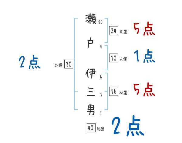 天運![]() | 瀬戸伊三男さんの天運は24画の5つ星!家庭運が良く順調な人生。金運にも恵まれる。 家系が持つ宿命的な運勢を表します。祖先から受け継いだ苗字ですので自分の力が及びません。家柄を象徴します。 |