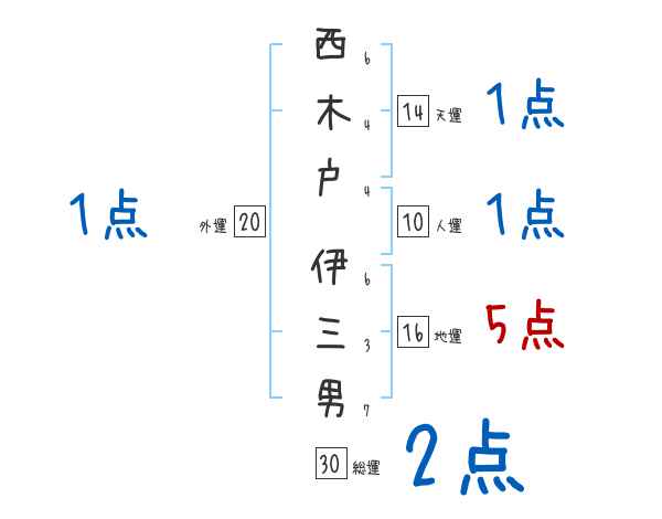 地運![]() | 西木戸伊三男さんの地運は16画の5つ星!人望が厚く大きく発展する。逆転成功が見える。 個性を表す基礎的な運勢です。性格形成や対人関係、行動力など家庭環境に影響されます。主に誕生してから20歳くらいまでの若年期の運勢を表します。 |