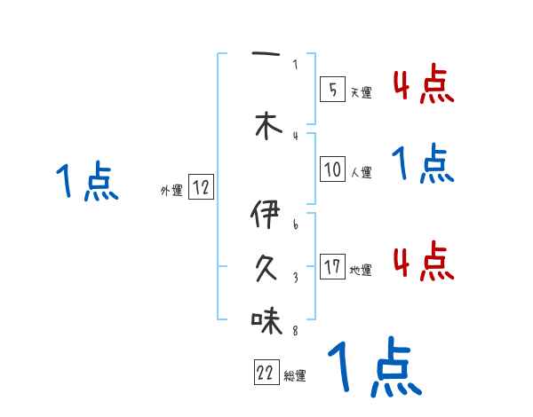 総運![]() | 一木伊久味さんの総運は22画の1つ星!努力することが苦手ないっぽう手先が器用。芸術性にも優れる。 あなたの人生を表す1番重要な運勢です。生涯を通じて影響する総合運となり、主に50歳以降の晩年期に影響を及ぼします。 |
