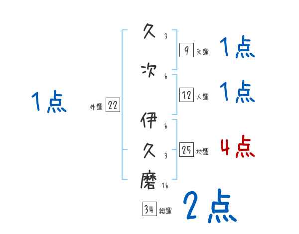 天運![]() | 久次伊久磨さんの天運は9画の1つ星!消極的で才能を発揮することが苦手なことも。周りの意見に耳を傾けましょう。 家系が持つ宿命的な運勢を表します。祖先から受け継いだ苗字ですので自分の力が及びません。家柄を象徴します。 |