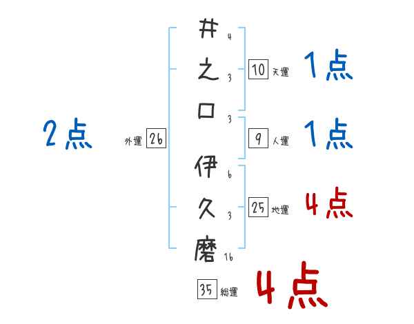 外運![]() | 井之口伊久磨さんの外運は26画の2つ星!波瀾万丈かも。信頼できる人を大事にしましょう。 生活面を象徴する運勢です。外部から受ける影響力を表し、結婚運、家庭運や職場、環境への順応性を表します。 |