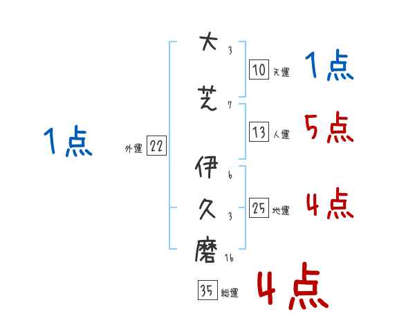 天運![]() | 大芝伊久磨さんの天運は10画の1つ星!不安を感じやすい傾向。ストレスを抱えないように注意しましょう。 家系が持つ宿命的な運勢を表します。祖先から受け継いだ苗字ですので自分の力が及びません。家柄を象徴します。 |
