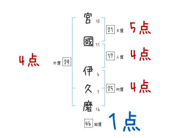 天運![]() | 宮國伊久磨さんの天運は21画の5つ星!統率力がある。独立し成功する。名誉を手に入れる。 家系が持つ宿命的な運勢を表します。祖先から受け継いだ苗字ですので自分の力が及びません。家柄を象徴します。 |