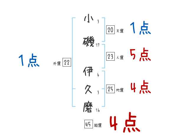 外運![]() | 小磯伊久磨さんの外運は22画の1つ星!努力することが苦手ないっぽう手先が器用。芸術性にも優れる。 生活面を象徴する運勢です。外部から受ける影響力を表し、結婚運、家庭運や職場、環境への順応性を表します。 |
