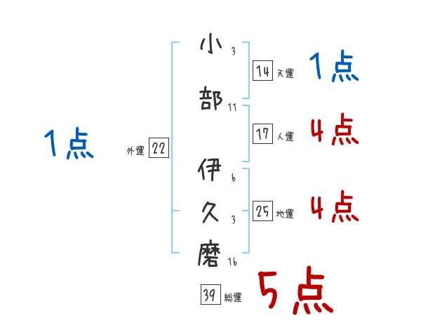 総運![]() | 小部伊久磨さんの総運は39画の5つ星!社交性に優れ人望が厚い。人の上に立ち成功する。 あなたの人生を表す1番重要な運勢です。生涯を通じて影響する総合運となり、主に50歳以降の晩年期に影響を及ぼします。 |