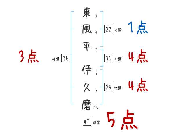 総運![]() | 東風平伊久磨さんの総運は47画の5つ星!実力が開花し発展する円満な人生。財に恵まれる。 あなたの人生を表す1番重要な運勢です。生涯を通じて影響する総合運となり、主に50歳以降の晩年期に影響を及ぼします。 |