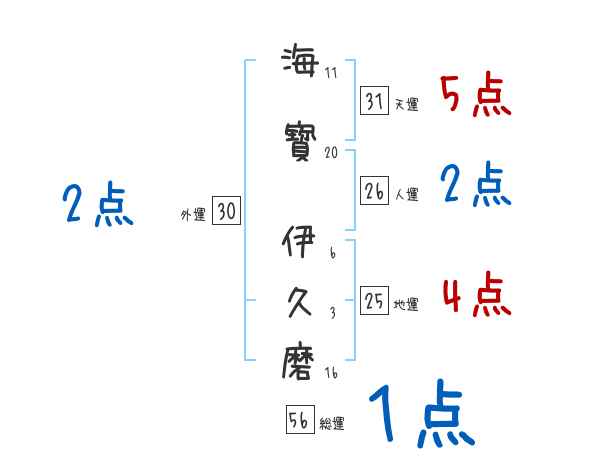 天運![]() | 海寳伊久磨さんの天運は31画の5つ星!社交性があり判断力に優れる。順風満帆な人生で円満な生活。 家系が持つ宿命的な運勢を表します。祖先から受け継いだ苗字ですので自分の力が及びません。家柄を象徴します。 |