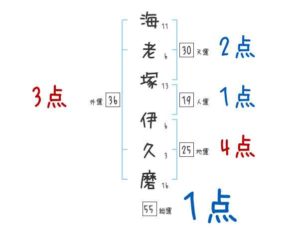 外運![]() | 海老塚伊久磨さんの外運は36画の3つ星!先見性が豊かです。多少神経質で苦労することも。 生活面を象徴する運勢です。外部から受ける影響力を表し、結婚運、家庭運や職場、環境への順応性を表します。 |