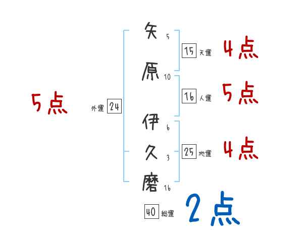 外運![]() | 矢原伊久磨さんの外運は24画の5つ星!家庭運が良く順調な人生。金運にも恵まれる。 生活面を象徴する運勢です。外部から受ける影響力を表し、結婚運、家庭運や職場、環境への順応性を表します。 |