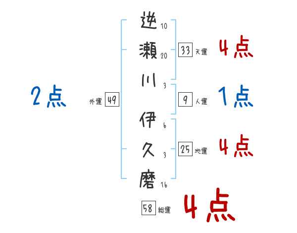 天運![]() | 逆瀬川伊久磨さんの天運は33画の4つ星!権力志向でプライドが高い。勇気があり運を切り開き成功する。 家系が持つ宿命的な運勢を表します。祖先から受け継いだ苗字ですので自分の力が及びません。家柄を象徴します。 |