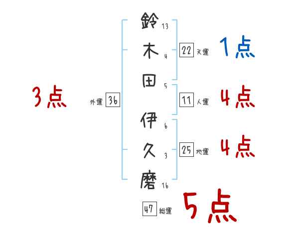 外運![]() | 鈴木田伊久磨さんの外運は36画の3つ星!先見性が豊かです。多少神経質で苦労することも。 生活面を象徴する運勢です。外部から受ける影響力を表し、結婚運、家庭運や職場、環境への順応性を表します。 |