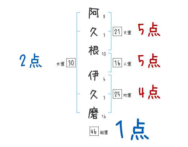 天運![]() | 阿久根伊久磨さんの天運は21画の5つ星!統率力がある。独立し成功する。名誉を手に入れる。 家系が持つ宿命的な運勢を表します。祖先から受け継いだ苗字ですので自分の力が及びません。家柄を象徴します。 |