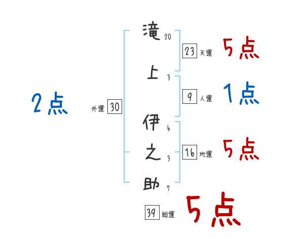 総運![]() | 滝上伊之助さんの総運は39画の5つ星!社交性に優れ人望が厚い。人の上に立ち成功する。 あなたの人生を表す1番重要な運勢です。生涯を通じて影響する総合運となり、主に50歳以降の晩年期に影響を及ぼします。 |