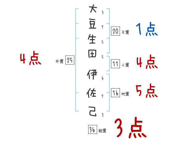 総運![]() | 大豆生田伊佐己さんの総運は36画の3つ星!先見性が豊かです。多少神経質で苦労することも。 あなたの人生を表す1番重要な運勢です。生涯を通じて影響する総合運となり、主に50歳以降の晩年期に影響を及ぼします。 |