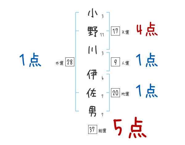 天運![]() | 小野川伊佐男さんの天運は17画の4つ星!積極的な行動力。地位を気づき財産を手に入れる。純粋な心と直感力。 家系が持つ宿命的な運勢を表します。祖先から受け継いだ苗字ですので自分の力が及びません。家柄を象徴します。 |