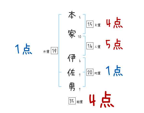 人運![]() | 本家伊佐男さんの人運は16画の5つ星!人望が厚く大きく発展する。逆転成功が見える。 性格や才能などを表す2番目に重要な運勢です。人間関係や協調性、社会的な成功に影響します。主に20歳から50歳ぐらいまでの中年期の運勢を表します。 |