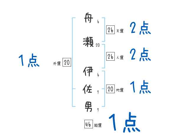 人運![]() | 舟瀬伊佐男さんの人運は26画の2つ星!波瀾万丈かも。信頼できる人を大事にしましょう。 性格や才能などを表す2番目に重要な運勢です。人間関係や協調性、社会的な成功に影響します。主に20歳から50歳ぐらいまでの中年期の運勢を表します。 |