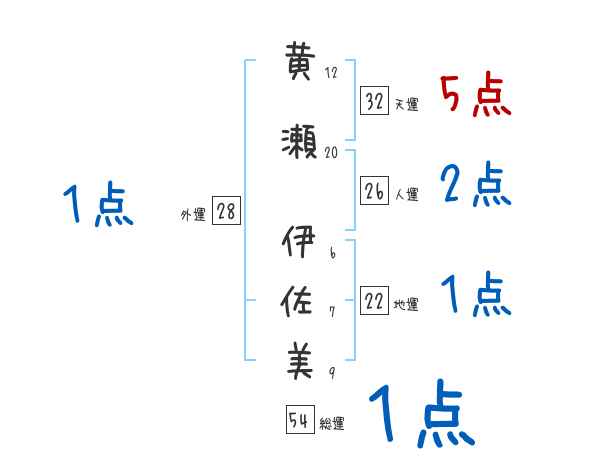 天運![]() | 黄瀬伊佐美さんの天運は32画の5つ星!柔軟性があり成功する。チャンスが多く金運が良い。 家系が持つ宿命的な運勢を表します。祖先から受け継いだ苗字ですので自分の力が及びません。家柄を象徴します。 |