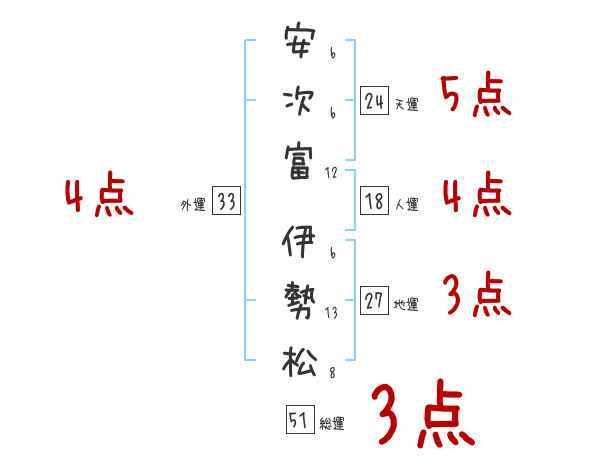 天運![]() | 安次富伊勢松さんの天運は24画の5つ星!家庭運が良く順調な人生。金運にも恵まれる。 家系が持つ宿命的な運勢を表します。祖先から受け継いだ苗字ですので自分の力が及びません。家柄を象徴します。 |