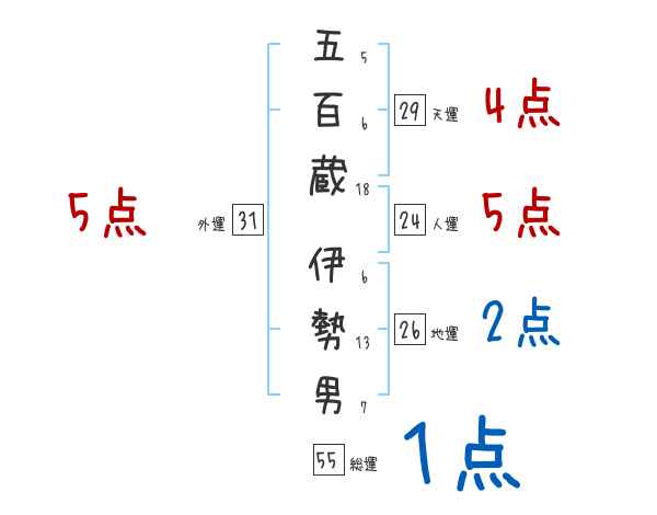 外運![]() | 五百蔵伊勢男さんの外運は31画の5つ星!社交性があり判断力に優れる。順風満帆な人生で円満な生活。 生活面を象徴する運勢です。外部から受ける影響力を表し、結婚運、家庭運や職場、環境への順応性を表します。 |