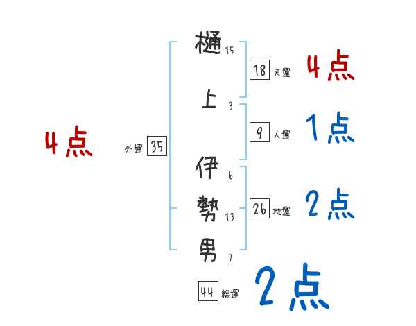 外運![]() | 樋上伊勢男さんの外運は35画の4つ星!温厚な性格で感受性が高い。穏和な性格で人望が厚い。 生活面を象徴する運勢です。外部から受ける影響力を表し、結婚運、家庭運や職場、環境への順応性を表します。 |