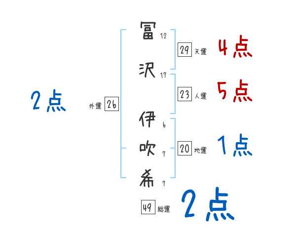 人運![]() | 冨沢伊吹希さんの人運は23画の5つ星!想像力に優れ活力がある。一代で成功し名誉を手に入れる。 性格や才能などを表す2番目に重要な運勢です。人間関係や協調性、社会的な成功に影響します。主に20歳から50歳ぐらいまでの中年期の運勢を表します。 |
