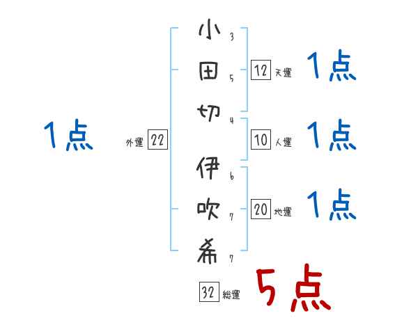 | 外運  | 小田切伊吹希さんの外運は22画の1つ星!努力することが苦手ないっぽう手先が器用。芸術性にも優れる。生活面を象徴する運勢です。外部から受ける影響力を表し、結婚運、家庭運や職場、環境への順応性を表します。 |