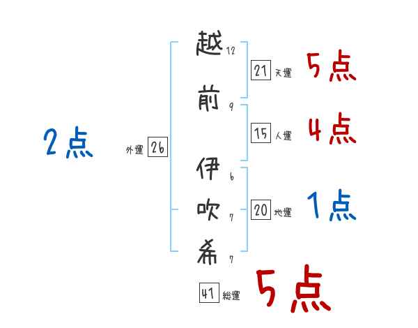 天運![]() | 越前伊吹希さんの天運は21画の5つ星!統率力がある。独立し成功する。名誉を手に入れる。 家系が持つ宿命的な運勢を表します。祖先から受け継いだ苗字ですので自分の力が及びません。家柄を象徴します。 |