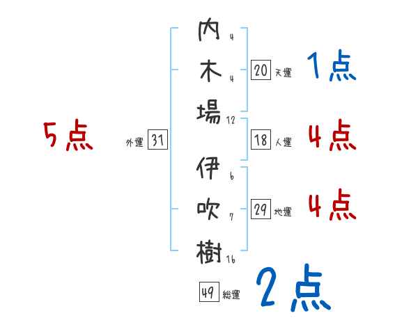 外運![]() | 内木場伊吹樹さんの外運は31画の5つ星!社交性があり判断力に優れる。順風満帆な人生で円満な生活。 生活面を象徴する運勢です。外部から受ける影響力を表し、結婚運、家庭運や職場、環境への順応性を表します。 |