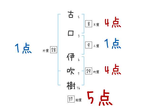 天運![]() | 古口伊吹樹さんの天運は8画の4つ星!勤勉家。根気強く努力し成功する。忍耐力がある。 家系が持つ宿命的な運勢を表します。祖先から受け継いだ苗字ですので自分の力が及びません。家柄を象徴します。 |