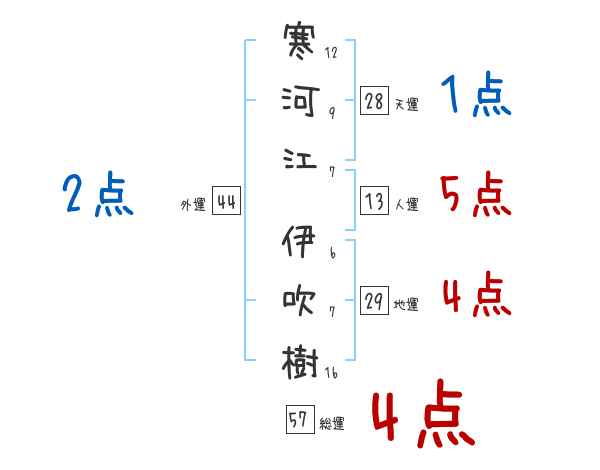 人運![]() | 寒河江伊吹樹さんの人運は13画の5つ星!才能に恵まれ人気がある。名声を手に入れる。円満な人生。 性格や才能などを表す2番目に重要な運勢です。人間関係や協調性、社会的な成功に影響します。主に20歳から50歳ぐらいまでの中年期の運勢を表します。 |