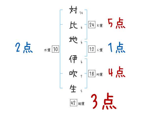 総運![]() | 対比地伊吹生さんの総運は42画の3つ星!病気に注意。多芸であるが消極的でおとなしい。 あなたの人生を表す1番重要な運勢です。生涯を通じて影響する総合運となり、主に50歳以降の晩年期に影響を及ぼします。 |