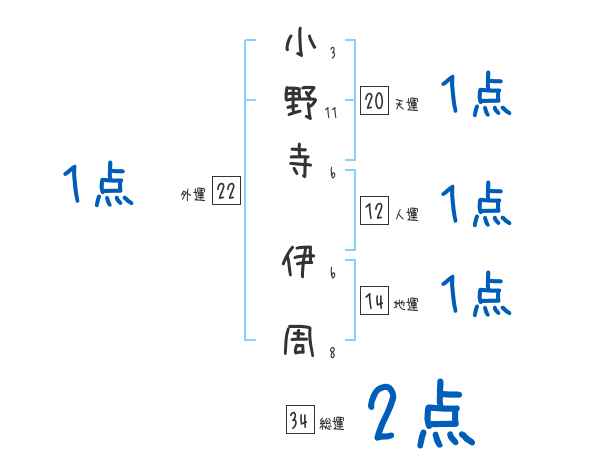 総運![]() | 小野寺伊周さんの総運は34画の2つ星!独創性に優れるが、自尊心が強く災難に注意しましょう。 あなたの人生を表す1番重要な運勢です。生涯を通じて影響する総合運となり、主に50歳以降の晩年期に影響を及ぼします。 |
