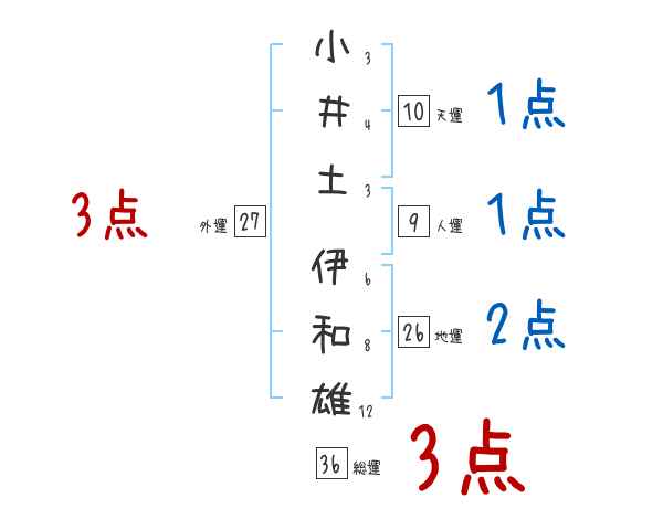 総運![]() | 小井土伊和雄さんの総運は36画の3つ星!先見性が豊かです。多少神経質で苦労することも。 あなたの人生を表す1番重要な運勢です。生涯を通じて影響する総合運となり、主に50歳以降の晩年期に影響を及ぼします。 |