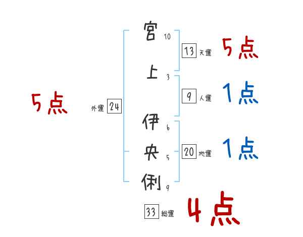 外運![]() | 宮上伊央俐さんの外運は24画の5つ星!家庭運が良く順調な人生。金運にも恵まれる。 生活面を象徴する運勢です。外部から受ける影響力を表し、結婚運、家庭運や職場、環境への順応性を表します。 |