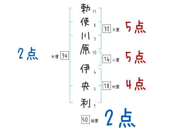 人運![]() | 勅使川原伊央利さんの人運は16画の5つ星!人望が厚く大きく発展する。逆転成功が見える。 性格や才能などを表す2番目に重要な運勢です。人間関係や協調性、社会的な成功に影響します。主に20歳から50歳ぐらいまでの中年期の運勢を表します。 |