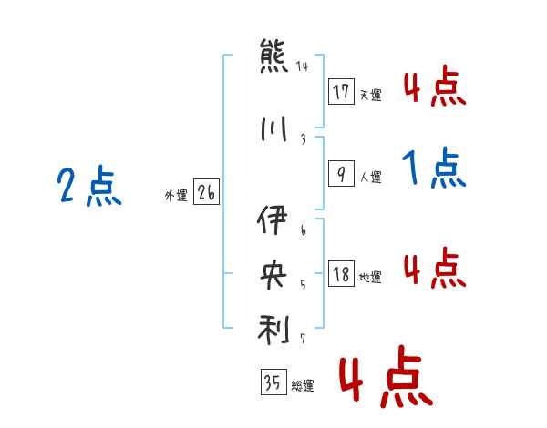 総運![]() | 熊川伊央利さんの総運は35画の4つ星!温厚な性格で感受性が高い。穏和な性格で人望が厚い。 あなたの人生を表す1番重要な運勢です。生涯を通じて影響する総合運となり、主に50歳以降の晩年期に影響を及ぼします。 |