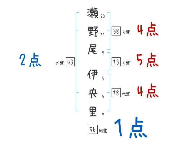 外運![]() | 瀬野尾伊央里さんの外運は43画の2つ星!頑固な性格で独立心が強いかも。やや非現実的で浪費に注意しましょう。 生活面を象徴する運勢です。外部から受ける影響力を表し、結婚運、家庭運や職場、環境への順応性を表します。 |