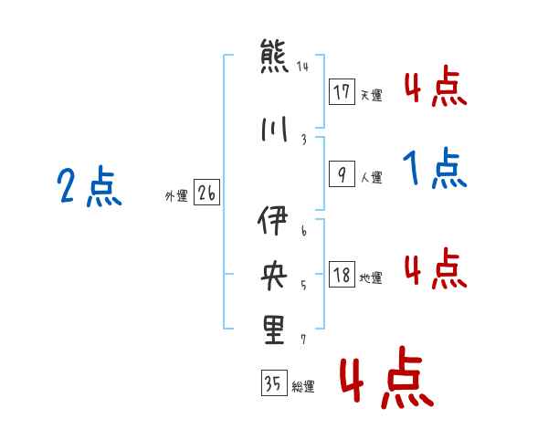 外運![]() | 熊川伊央里さんの外運は26画の2つ星!波瀾万丈かも。信頼できる人を大事にしましょう。 生活面を象徴する運勢です。外部から受ける影響力を表し、結婚運、家庭運や職場、環境への順応性を表します。 |
